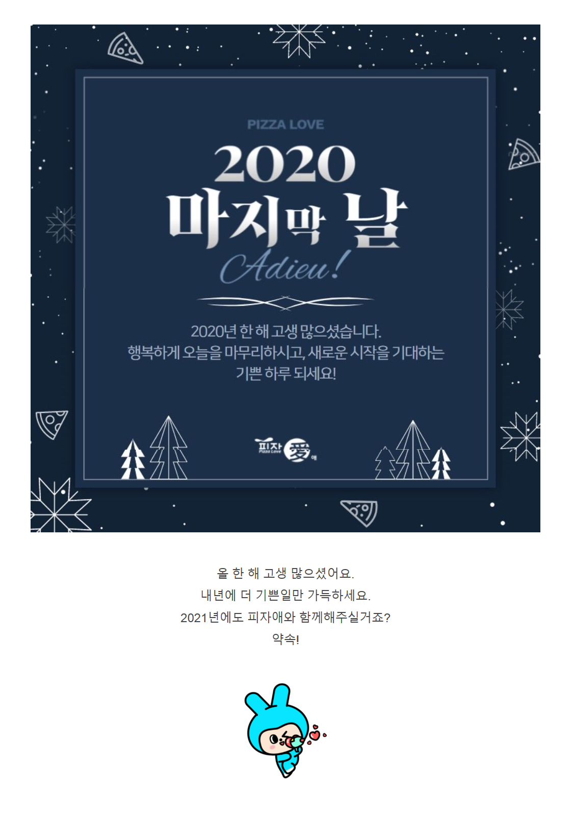 [SNS] 2020년 마지막날 페이지 정보 작성자(주)피자애 작성일20-12-31 13:30 조회수1,733회 댓글0건 첨부파일 2020-12-31 13;28;17.PNG (722.4K) 12회 다운로드 DATE : 2020-12-31 13:30:42 이전글 다음글 목록 본문 댓글목록 등록된 댓글이 없습니다. 이전글 다음글 목록